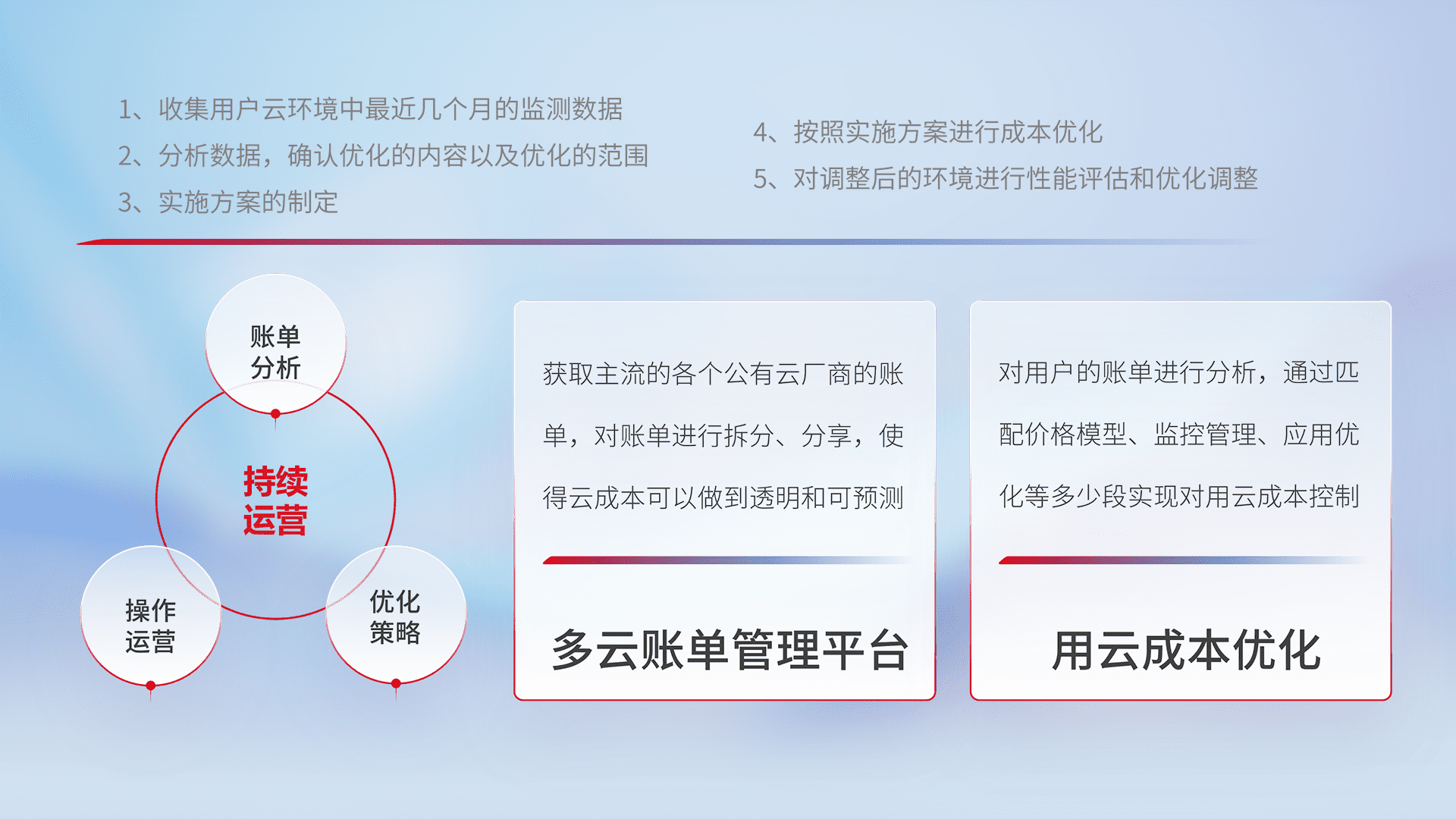 通过多云纳管,,,以统一的资源数据模型把客户的云资源进行抽象和封装,,,进而实现对多云资源的统一操作,,,,保障云资源管理的可靠性、、、稳定性与可用性。。量身定制化运维内容,,配置、、、、开发运维、、补丁管理、、、备份、、、监控、、认证和访问管理、、审计和日常巡检等,,,保障在用云过程中的可靠度,,,,稳定度以及高可用率。。