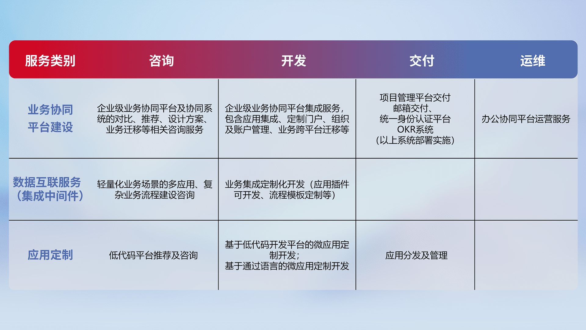 针对钉钉、、、企微、、、IDaas等平台级产品提供产品的规划、、、方案、、、、交付、、、定制化开发等服务,,,实现如统一协同办公、、、智能客户服务、、、、混合会议管理、、、、智能数据查询、、等业务场景,,,实现数字化转型。。。。